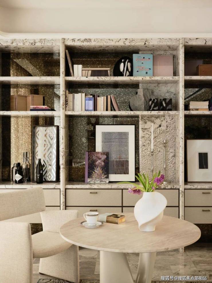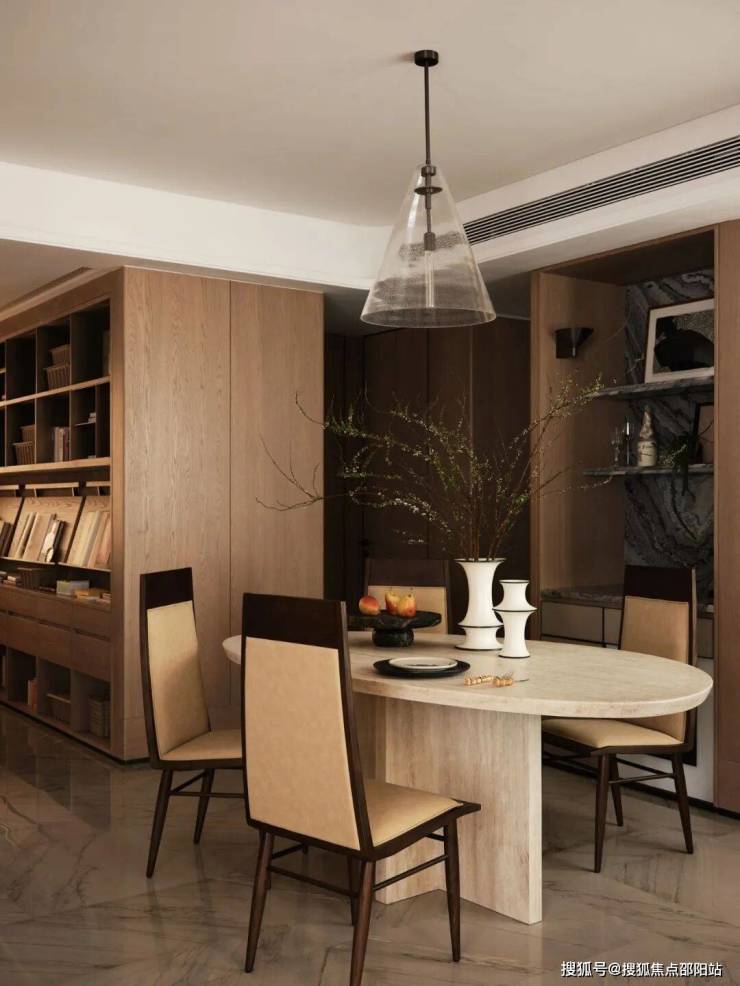 客厅通过设计包容空间情绪的诞生,和谐、温润、柔软。为了空间叙事的一致性,墙身竖向采用圆弧的设计手法,通过局部玉石的点缀构成精致优雅的第一感受。双面沙发置于客厅中央,一面作为会客厅,一面通过圆桌组合形成多功能X空间,扩展空间的功能使用界限。