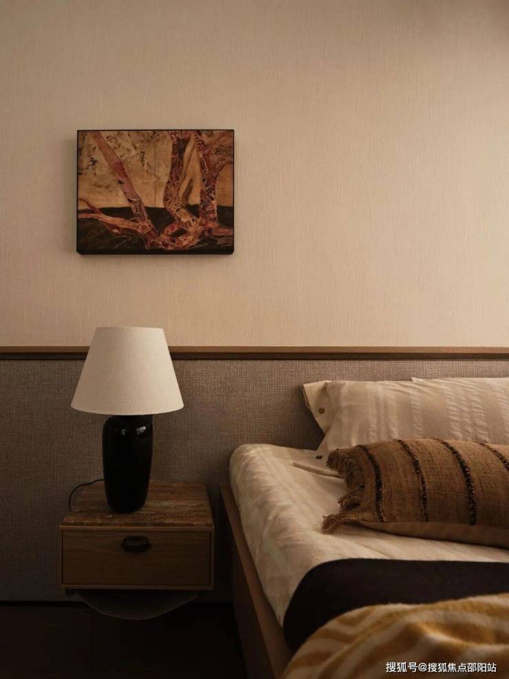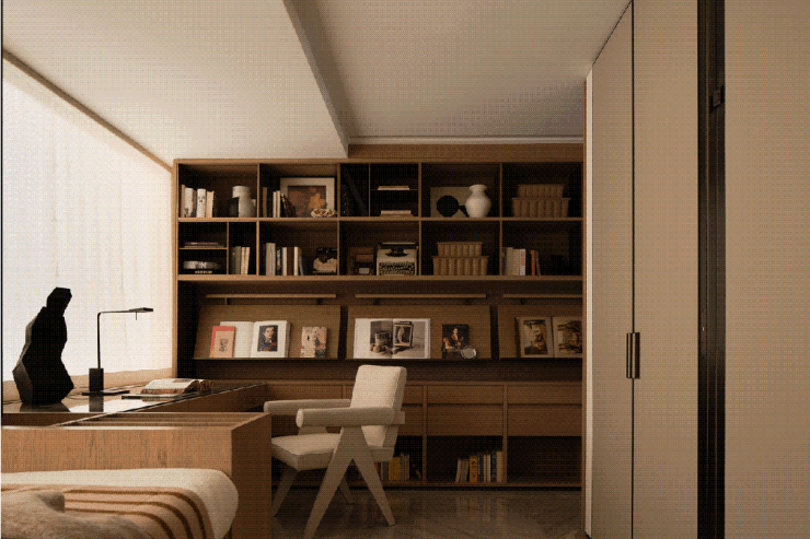 主卧整体的色彩和形制偏向平实,通过硬装细节的打造和软装的灵动来活跃整个空间的氛围调性。