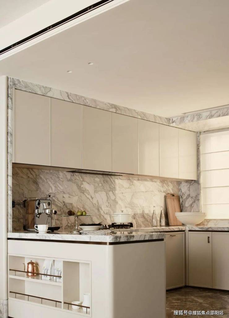 入户玄关与客厅、餐厅、厨房联动,将各个空间的生活动线和收纳动线汇总在一条通道之上,有效释放了过渡空间的尺度。设计将原有的封闭式厨房更改为U字形厨房,岛台成为链接客厅与厨房的功能区域,让家庭之间的互动更为通畅。