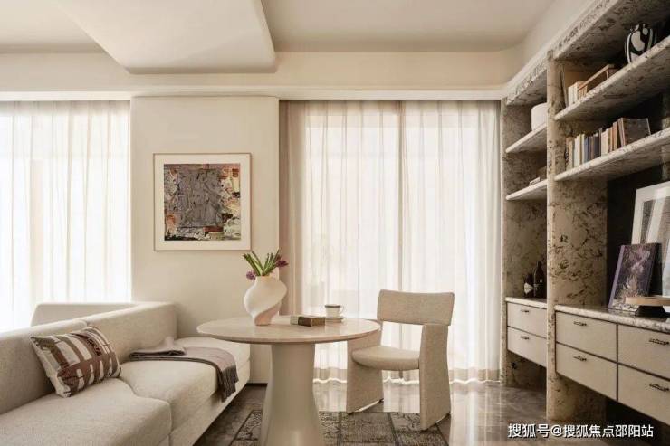 X空间结合客厅双面沙发尺度配置圆桌,这里可以是主人平时的工作室,也可以是与好友、家人共享下午茶的放松角落。