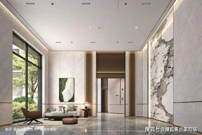 约6米舒展层高采光大堂,均有采光幕墙;楼栋大堂专属岩板背景墙,潘多拉奢石纹理,内嵌隐藏式光源,设备巧妙暗藏式处理;充分从人性化角度出发打造舒适休息区、会客厅。