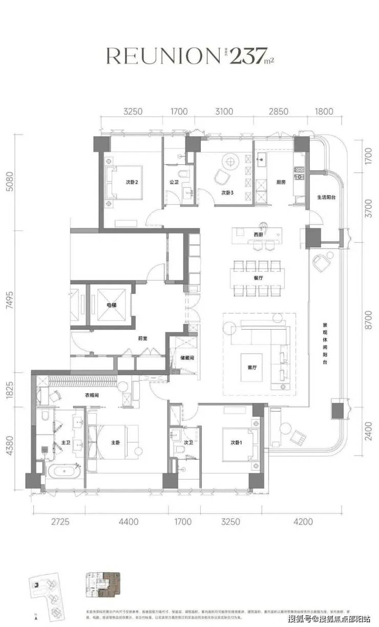 建面约197㎡户型配备7.95米长的景观阳台和2.05米长的生活阳台,连在一起达到了约10米的超长阳台,加上约2.2米的超宽尺寸,整个阳台的面积达到了约22㎡,相较其他竞品来说不是一般的阔绰。