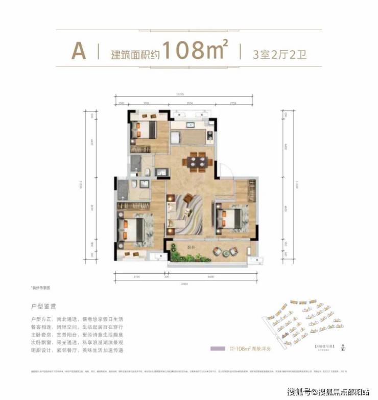 建面约108㎡三房两厅两卫○户型方正,南北通透,惬意悠享假日生活○餐客相连,阔绰空间,生活起居自在穿行○主卧套房,宽景阳台,更添诗意生活趣意○次卧飘窗,采光充足,私享浪漫湖滨景观○明厨设计,紧邻餐厅,美味生活加速传递