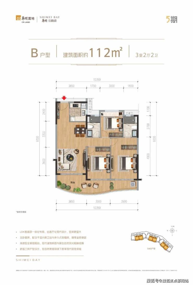 |建筑面积约105㎡○三卫设计,舒适起居,生活自在不拥挤○户型方正,全明设计,纵览山海风景○LDKB专享度假感格局,丰富生活层次○餐客厨与卧室,南向三开间,阳光满室○套房式主卧,约8.4m朗阔阳台,环瞰山海