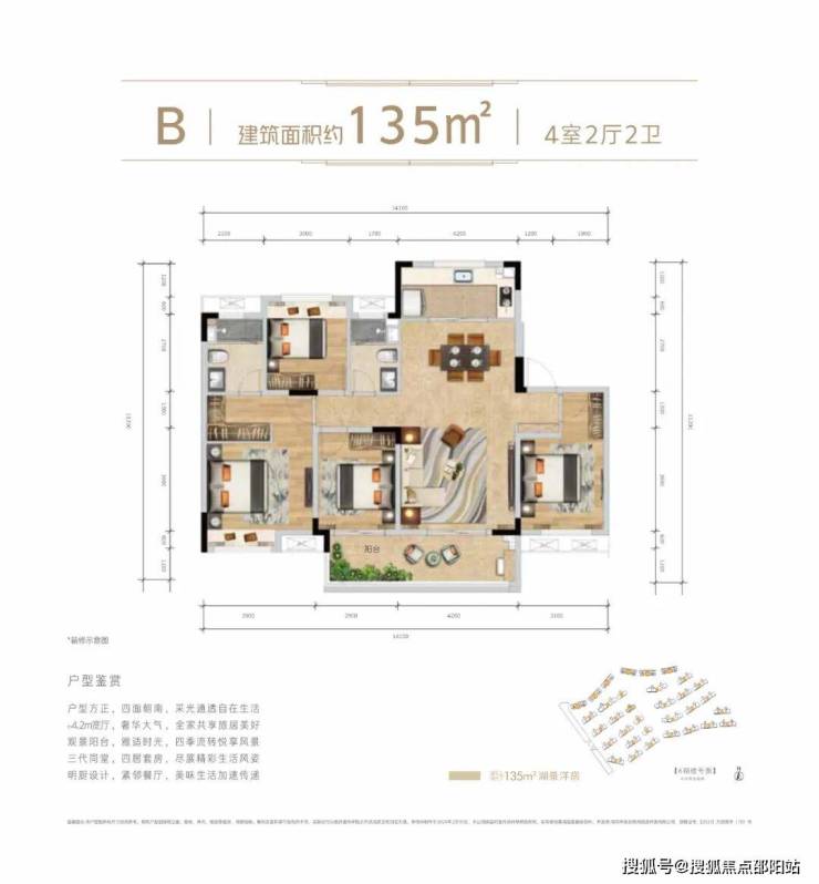 建面约135㎡四房两厅两卫○户型方正,四面朝南,采光充足自在生活○约4.2m宽厅,奢华大气,全家共享旅居美好○观景阳台,雅适时光,四季流转悦享风景○三代同堂,四居套房,尽展精彩生活风姿○明厨设计,紧邻餐厅,美味生活加速传递