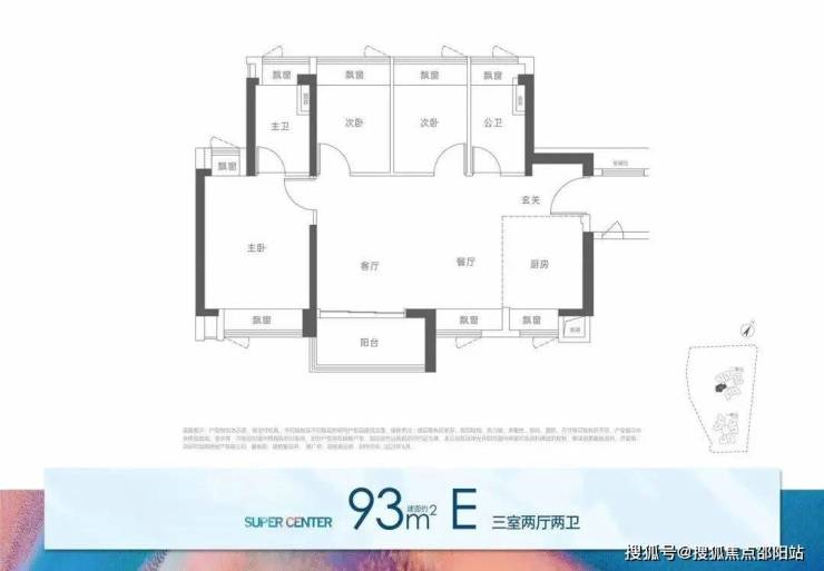 93平3房2卫有两个户型,以上是传统动静分离户型,分为C和D两个镜像户型。以下还有一个横厅户型: