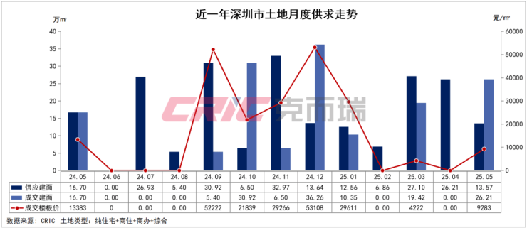 5月,深圳供应2宗居住用地,总建面13.57万㎡。成交2宗商办地,总建面26.21万㎡。