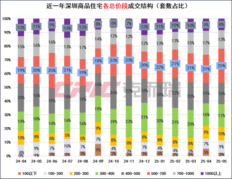 5月深圳商品住宅面积段主力成交是90-120㎡,占比高达37%。总价段成交主力是500-700万元的产品,主力成交项目都是【鹏宸云筑】。