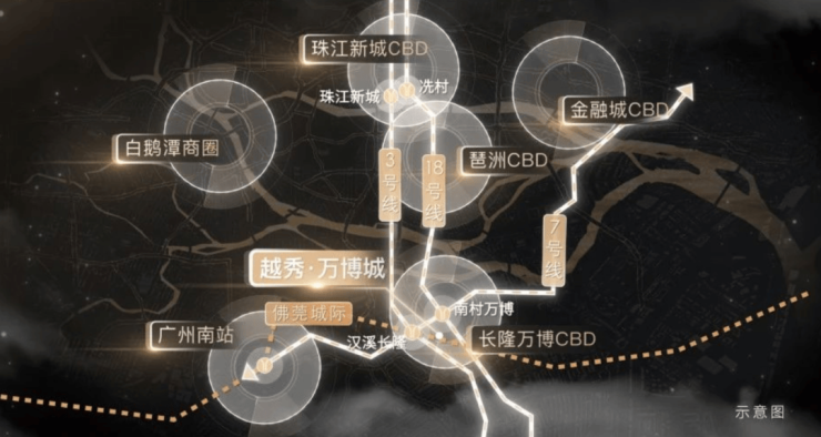 项目到南村万博E2口约1公里,可以乘坐7号线18号线,7号线往西通到南站和佛山的顺德美的大道。往东北方向连接我们的大学城,然后上去科学城的燕山站,把东部连起来啊。18号线从南沙天河,南北贯通,3站琶洲,4站冼村。后期往南通中山,往北到花都。