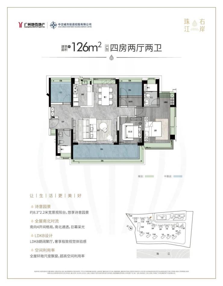 建面约126平四房两卫有横厅和竖厅可选,各具特色。126平横厅户型,同样采用LDKB一体化、南向四开间设计,南北通透。约8.3*2.2米的的超长景观阳台,让园景一览眼底,也进一步提升了整体的空间尺度感。