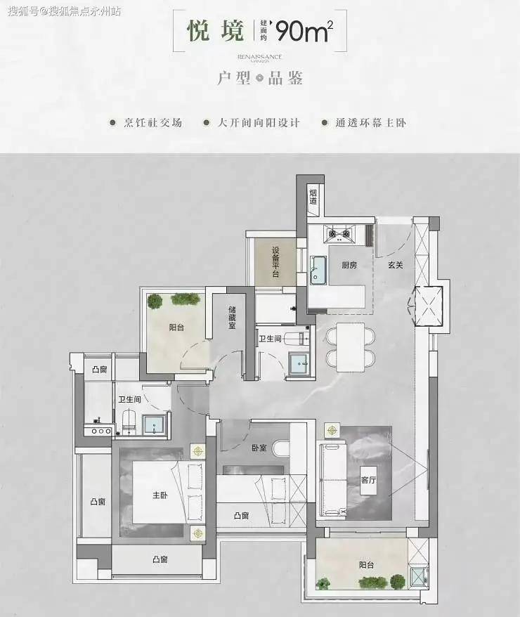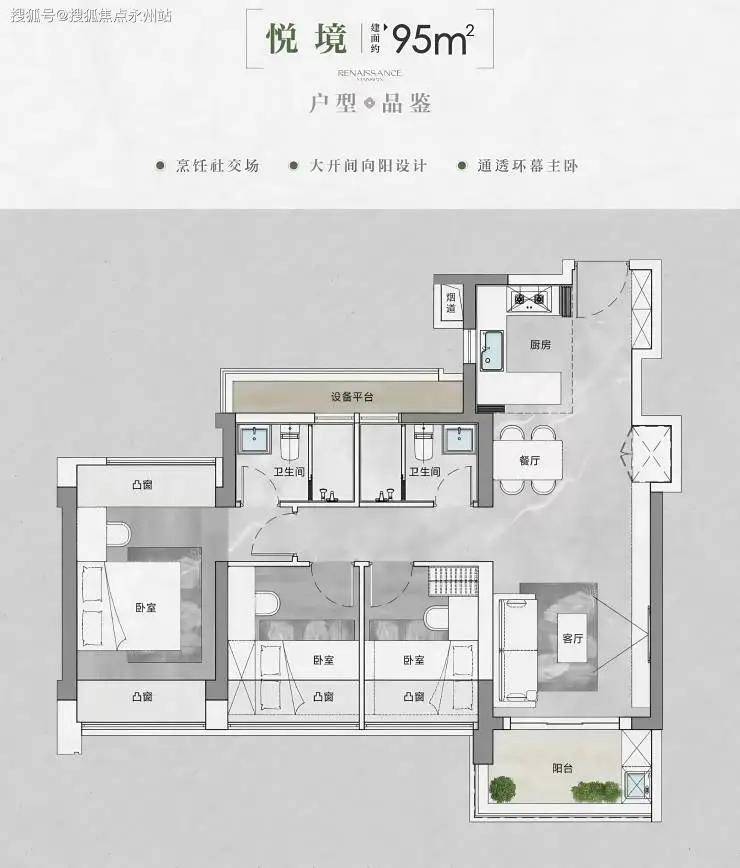 95㎡户型:阳台+3卧室同一个朝向,如果是东南或者西南,这种户型的采光会非常的不错;缺点就是:走道过长,有点浪费空间;主卧的设计很有意思,双飘窗南北通透的格局,而且主卧的卫生间相对而言比较独立。