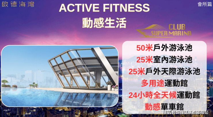 项目会所住客会所命名为“Club Super Marina”,设有4大主题,包括12大园林主题,3大动感生活设施,包括3大游泳池,24小时互动健身馆,幻变多功能运动馆,另设有逾1.5万尺儿童天地和3大打卡派对天地,设施齐全完善。