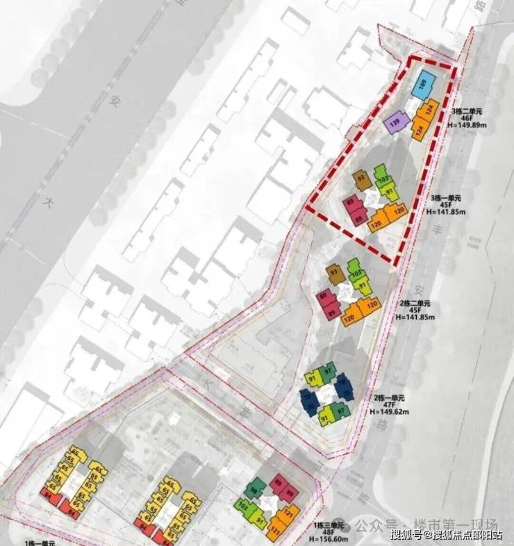 南地块(01-02),建设用地面积1.75万㎡,总建筑面积18.28万㎡,计容建筑面积13.51万㎡,容积率7.72。规划建设3栋(48-53层)超高层住宅,总户数1396户,其中保障房1104户,普通商品房住宅292户,机动停车位1411个。