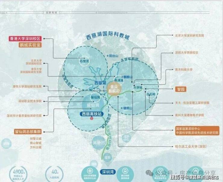 执掌湾区科创核心,定鼎城市未来价值高地。集智纳贤、创新不断。规划面积69.8平方公里的西丽湖国际科教城正显现“创新加速度”,从2002年开始,深圳在其周边布局了大学城,清华、北大、南科大等高校,以及鹏城实验室等科研机构相继入驻。目前,这里已集聚35名全职院士、多所高校单位超8.6万名在校师生,入驻国家、省、市级创新载体超500家,日渐形成粤港澳大湾区发展的“知识引擎”。
