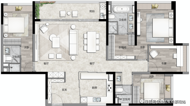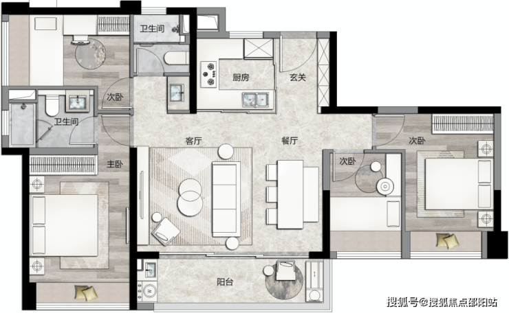 约170㎡户型,结构上实现了3个带独立卫生间的完整居住空间,就算是三代同堂,也能互不干扰。
