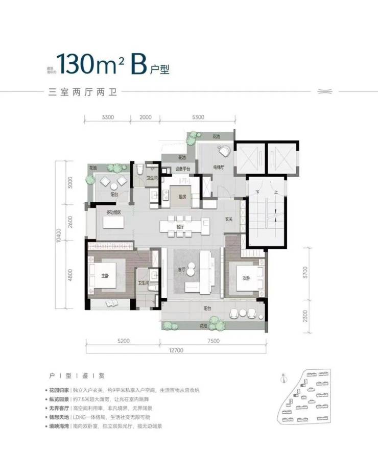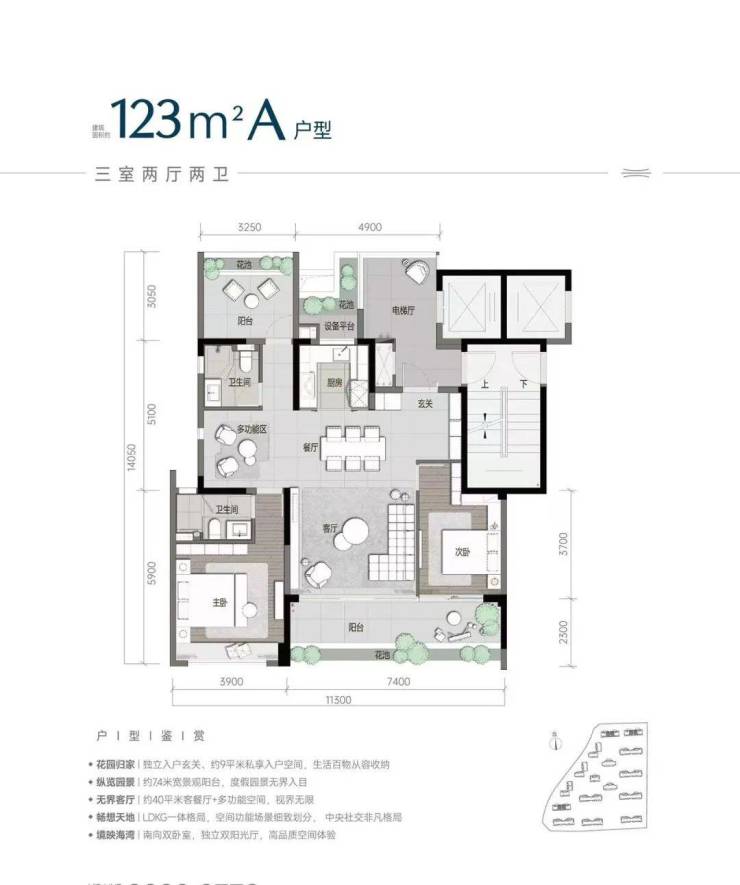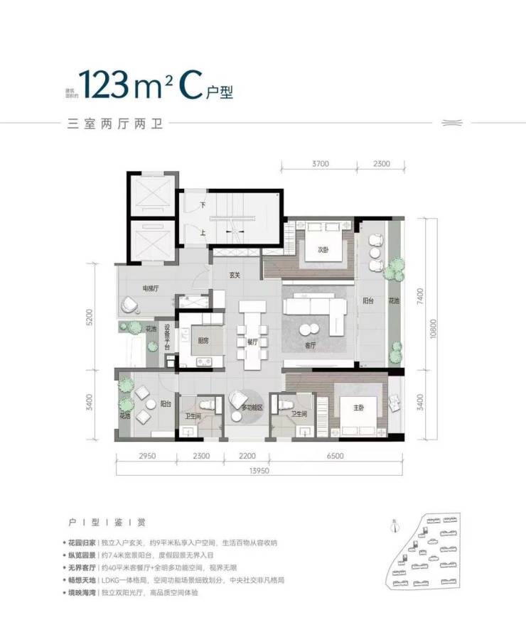 如 123 平米舒适三房,有独立入户玄关、约 7.4 米宽景阳台、LDKG 一体格局等亮点;