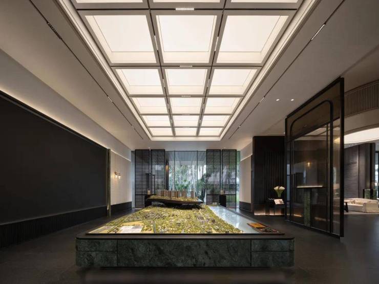 水系庭院融入海洋文化元素,连接内外空间。沙盘区域借鉴酒店设计,弱化销售气息,光影随光线变化,落地玻璃使大会客厅与自然融合,会客大厅以游艇为灵感,布局通透自然。