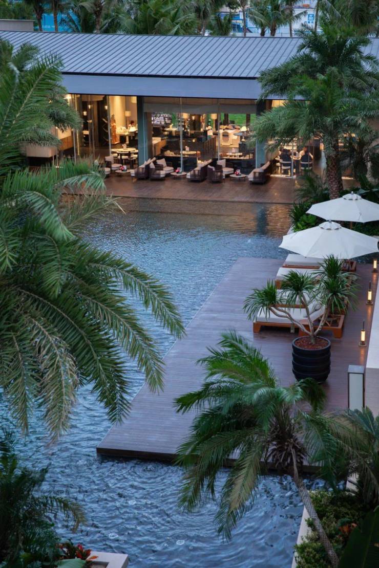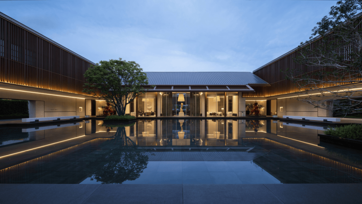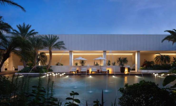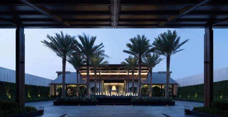 社区会所采用中轴对称布局,建筑、庭院等元素打破室内外界限。从南面落客区花园进入,棕榈树与热带庭院营造出度假氛围。