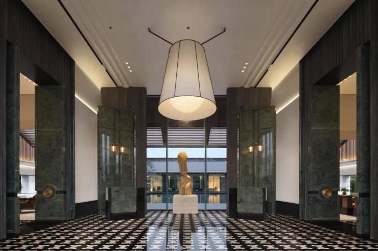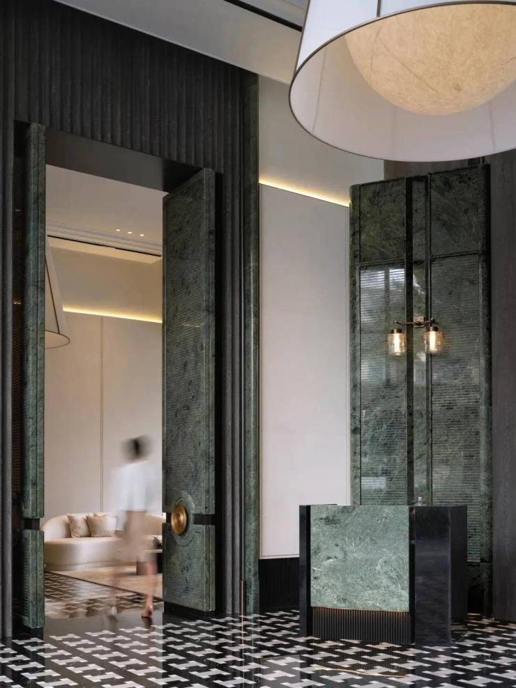 门厅的拼花地砖、吊灯、石门及木雕等,彰显品质。会客厅以实木和大理石为主材,营造高奢氛围,墙面装饰精致,沙发与茶几搭配和谐。艺廊旁空间与窗外景色相互映衬。