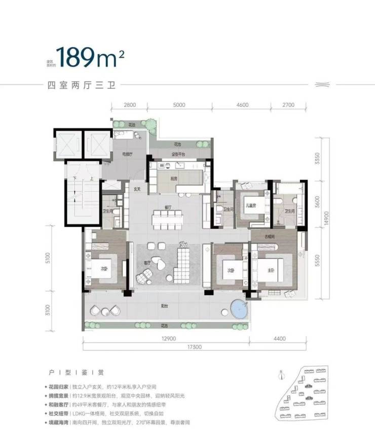 189 平米奢华四房,约 12.9 米宽景观阳台、LDKG 一体格局且社交双厨系统,空间奢阔。