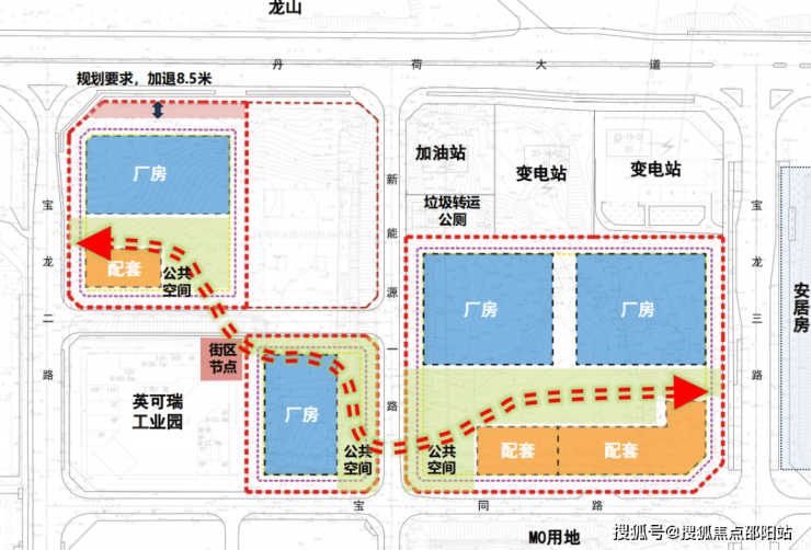 以绿色活力轴为动线,串联地块公共空间,打造绿色生态,高效共享的产业集群。
