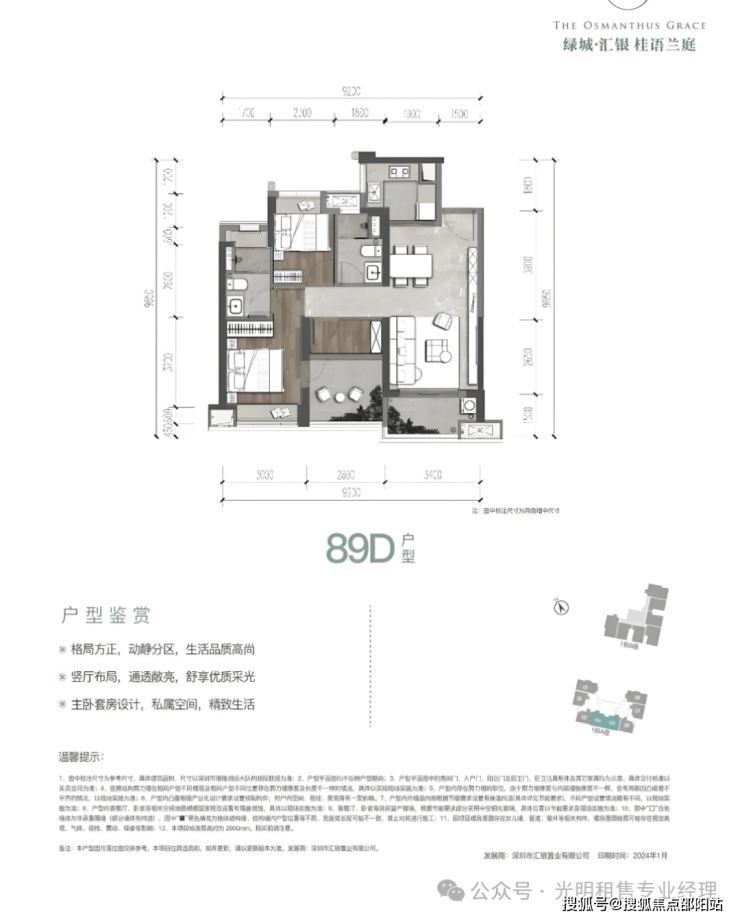 89㎡的3房2厅2卫(D户型),设计的是经典竖厅格局,餐客厅一体化,客厅3.4米开间,三开间朝南,3个卧室分别是3米/2.8米/2.3米的宽度,U型厨房,阳台1.5米进深,西南朝向。