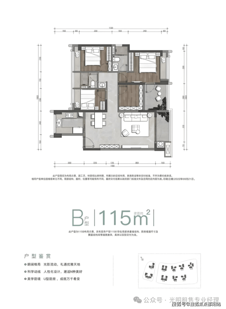 115㎡的4房2厅2卫,设计的是竖厅格局,餐客厅一体化,客厅3.9米开间,3个卧室分别是3.3米/2.75米/2.5米/2.3米的宽度,U型厨房,公卫三段式分离设计,阳台1.5米进深,有西北或东南朝向。