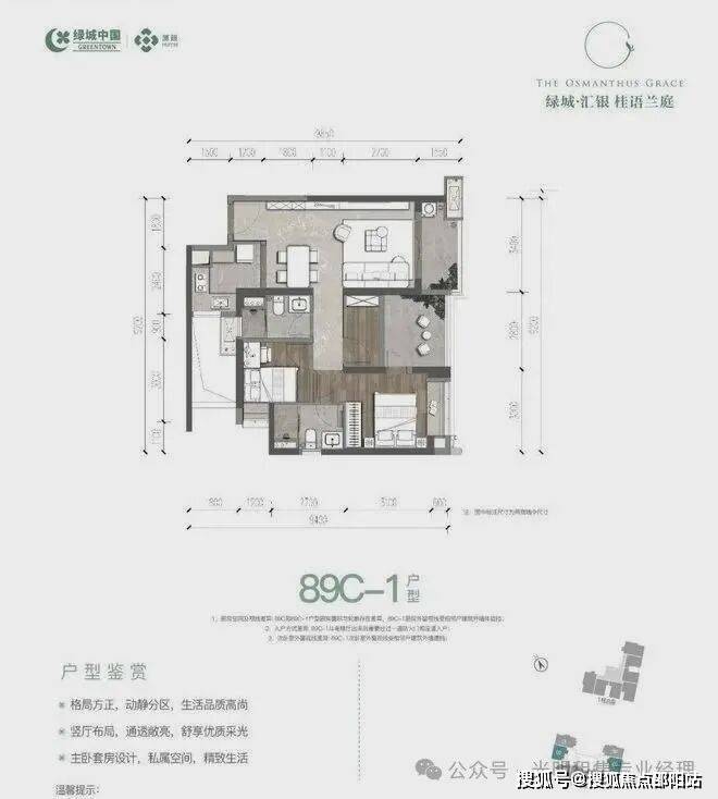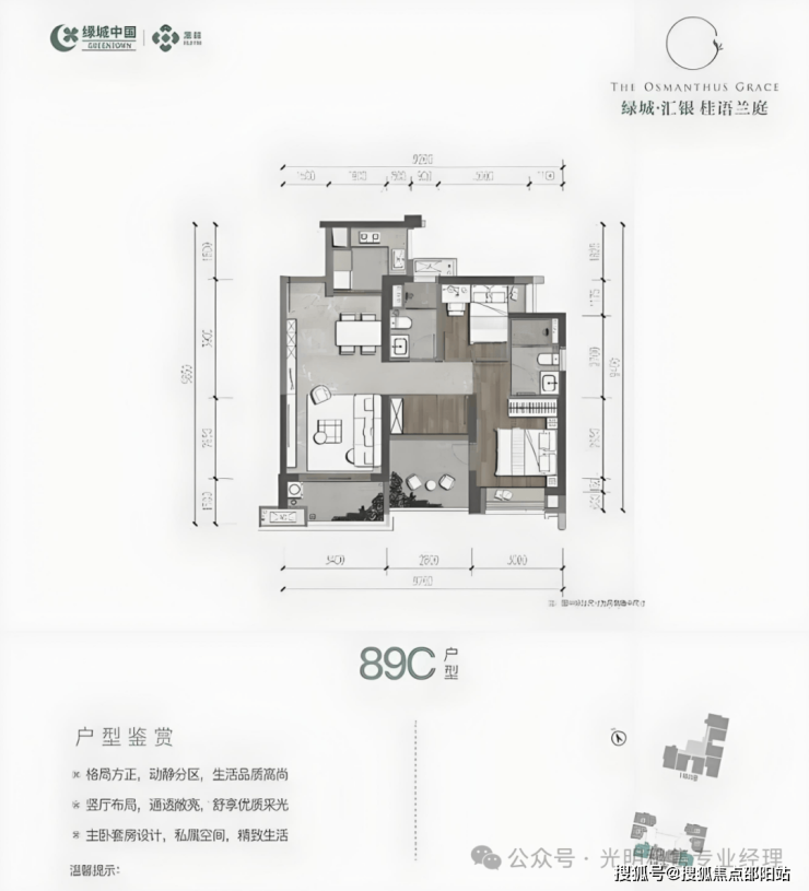 89㎡的3房2厅2卫(C户型),设计的是经典竖厅格局,餐客厅一体化,客厅3.4米开间,三开间朝南,3个卧室分别是3米/2.8米/2.4米的宽度,U型厨房,阳台1.5米进深,西南朝向。