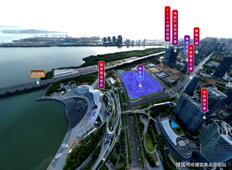 南街坊地块正对着素有“湾区之光”的欢乐海岸摩天轮、“湾区之眼”的大型文化综合体,拥有得天独厚的前海三湾城市景观和稀缺海景。