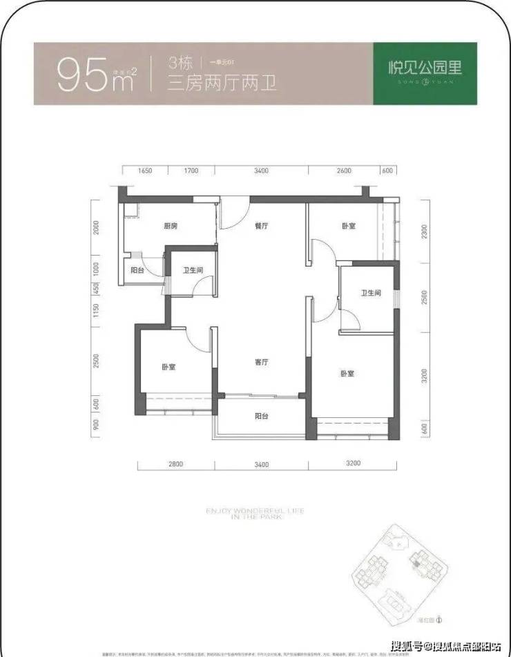 95㎡的3房2厅2卫,仅3栋1单元01户型,设计的是竖厅双龙抱珠格局,客厅3.4米开间,三开间朝南,3个卧室分别做到了3.2米/2.8米/2.3米的宽度,L型厨房带1个生活阳台,公卫三段式分离,得房率73.71%(不含赠送),西南朝向。