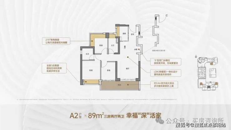 A2户型-约89㎡3房2厅2卫:户型分布在1、2、5单元,阳台南向、东向、西向均有选择。