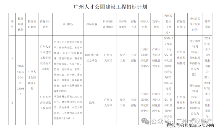 最近,广州人才公园建设招标计划公布,包括建设工程勘察设计施工总承包和建设工程监理,预计总投资2.45亿。