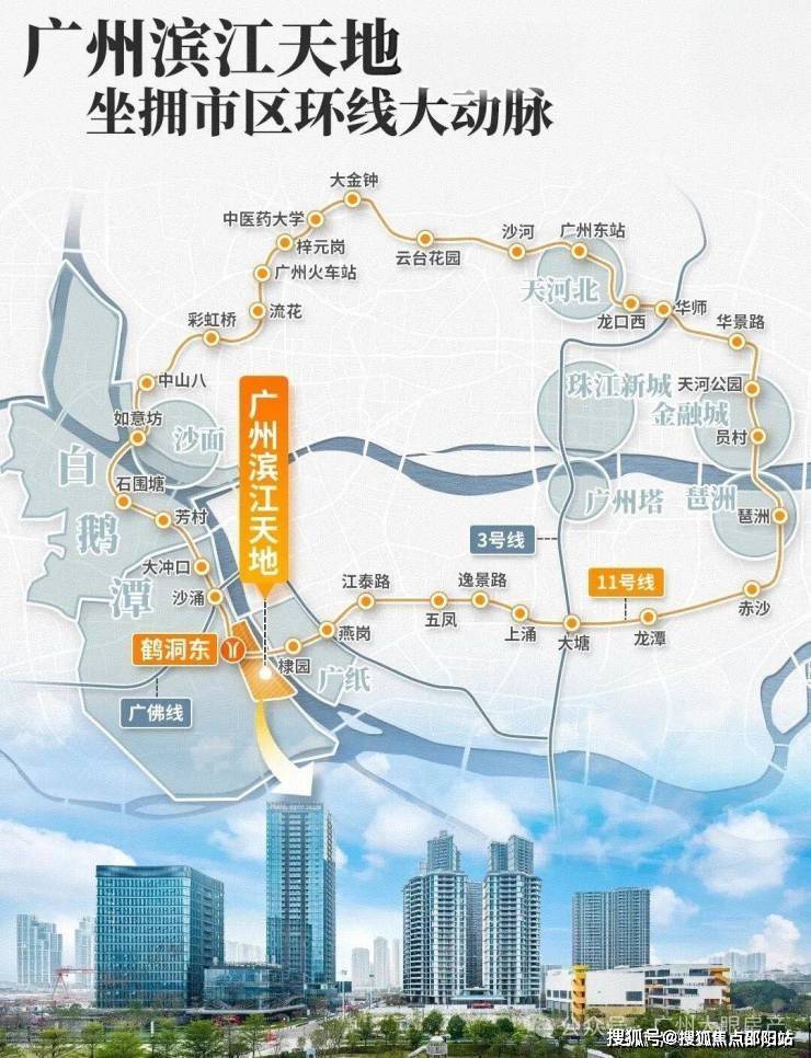 广州11号线鹤洞东站地铁上盖,拥有3横2纵大路网+公交站场+水上巴士,集水、陆、轨等多维交通方式于一体,半小时城央生活圈,1小时湾区生活圈。