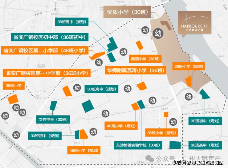 社区自建1所幼儿园+1所小学,首期将配建一所12个班幼儿园和30班优质小学广东外语外贸大学附属小学(已建成,24年9月已开学)
