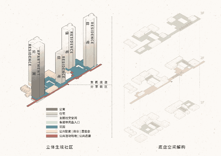 项目创新打造地上三层、地下三层式立体社区,把商业、配套、景观全部叠加到住宅下放,形成超级底盘,形成一个立体、私密、生机、全龄共鸣的生态系统。