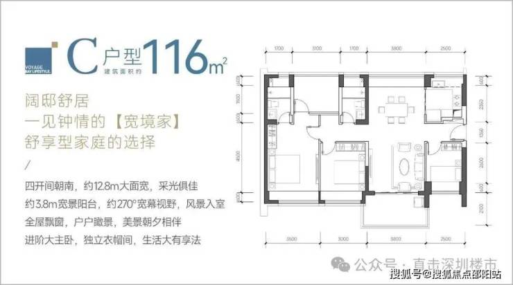 116㎡的4房2厅2卫,C户型,设计的是竖厅南北通透格局,餐客厅一体化设计,客厅3.8米开间,四开间朝南,4个卧室分别做到了主卧17.85㎡/次卧11.4㎡/次卧9.3㎡/次卧8㎡(包含墙体飘窗),都不用搭配飘窗做床,U型厨房,卫生间干湿分离,得房率约:93.13%(包含赠送),阳台主朝西南、东南或正南向。