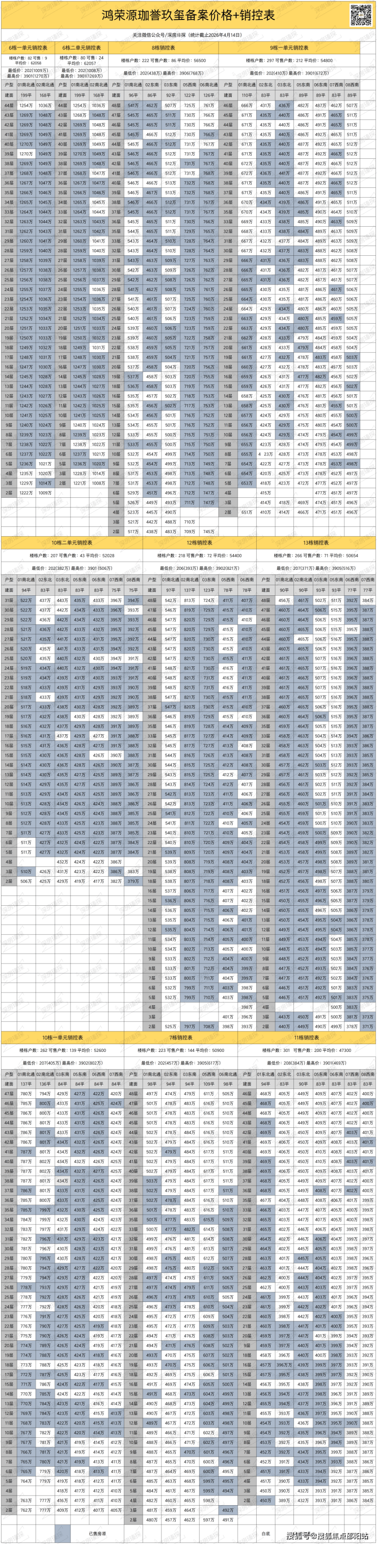 下面罗sir是鸿荣源珈誉玖玺全套的备案价格+销控表,可以作为参考,如果想要具体的房号折后价格表,或者后期最新的销控,可以联系罗sir。