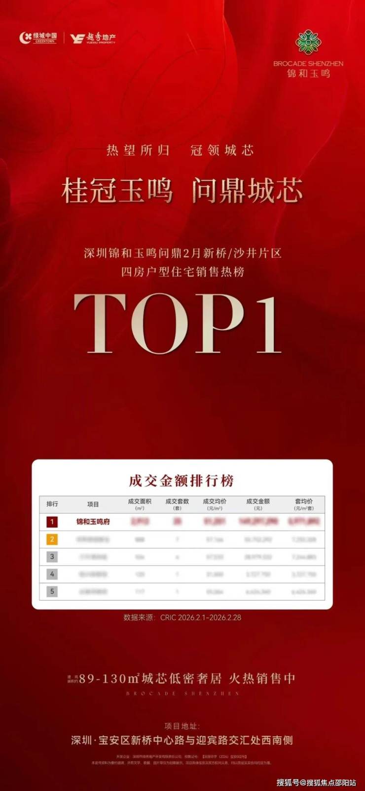 《绿城越秀锦和玉鸣》位于深圳市宝安区新桥街道,是在2025版《住宅项目规范》新国标发布后,于2025年8月4日深圳集中土拍供地,由绿城集团以12.15亿元竞得,溢价率11.5%,楼面价20364元/㎡,也是深圳首个按新国标建设的楼盘,得房率超100%,容积率低至3.1,总高只有16-25层。项目于2026年1月16日取证入市,首推1栋跟6栋,共185套房源,面积有89㎡的3房2厅2卫,104-107-127-130㎡的4房2厅2卫户型,2梯5户/2梯6户设计,合同约定在2027年11月15日带精装交房,位置属于非限购区,全国购房者均可购买。