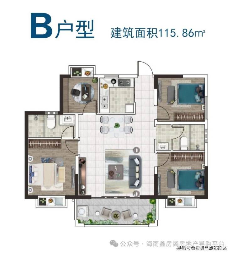 户型分为A型103.84㎡、B型115.86㎡、C型112.38㎡,A+复式型199.19㎡、B+复式型215.72㎡、C+复式型231.04㎡六种。