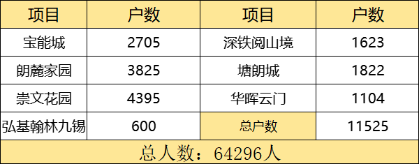 500米内汇聚宝能城(2705户)、朗麓家园(3825户)、崇文花园(4395户)、深铁阅山境(1623户)、塘朗城(1822户)、华晖云门(1104户)、弘基翰林九锡(600户)等7个高阶住区,约 16074户家庭,高净值人群约6.4万人(以每户4名家庭成员计算)。