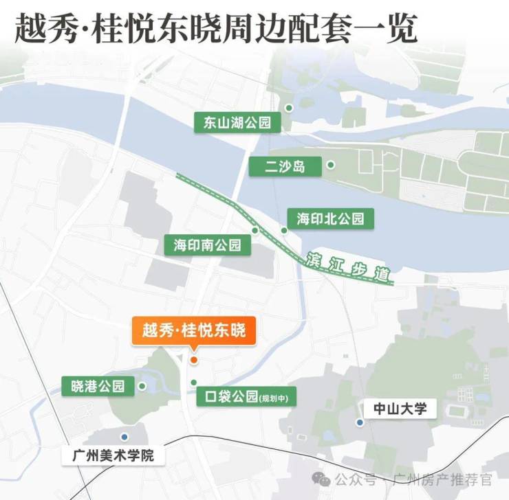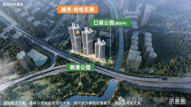 根据规划,未来将沿越秀·桂悦东晓西侧和南侧,建设绿地及口袋公园,通过绿道串联起珠江沿岸及周边五大公园,形成家门口的生态绿色系统。