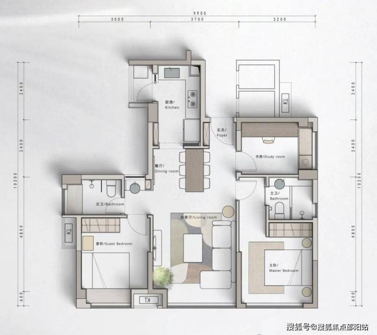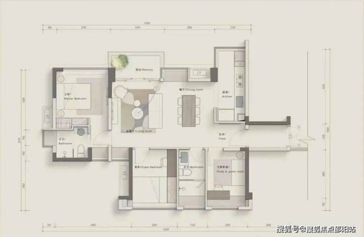 约168㎡:3+1房2卫,南北通透,灵动空间可作书房/家庭活动区;
