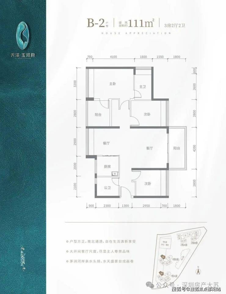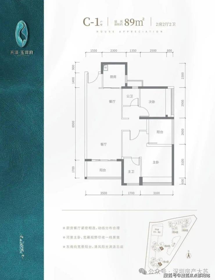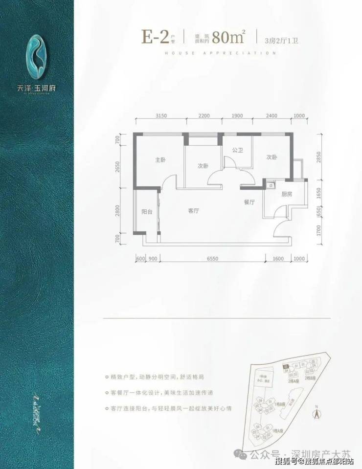 横厅南北通透格局,约6.5米大阳台连接客厅跟次卧,客餐厅开间约7.3米,双套房设计,南面套房开间约3.5米,带一个独立阳台,北面套房开间约3.6米,两个次卧开间约3.1米,约2.6米;阳台东南朝向,看茅洲河景观。
