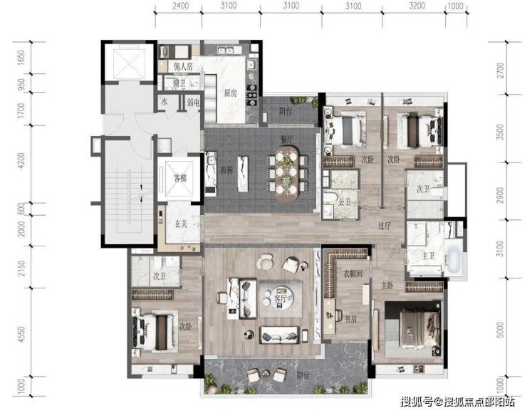 320㎡的五房的户型更奢侈了,竟然有2条主要过道!衣帽间大得离谱,能泡澡的主卫,还能欣赏到南向的自然山体!