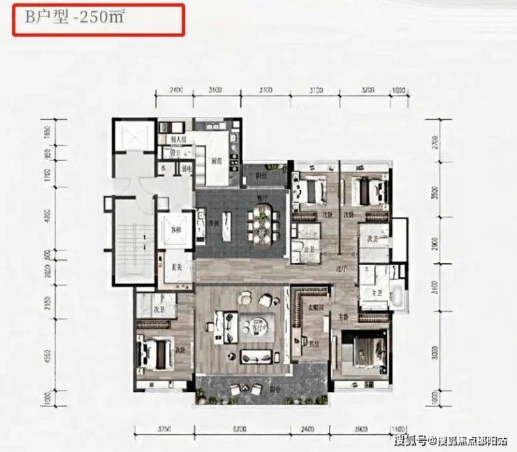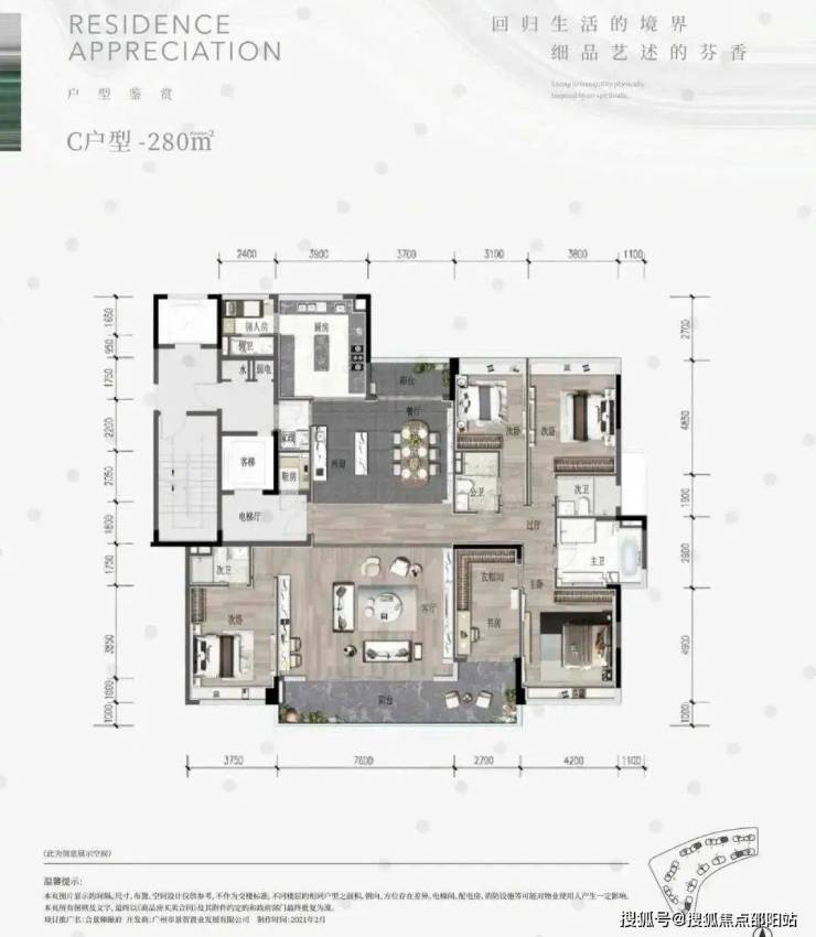 250㎡六房户型全户型南北对流,比起200㎡的户型,它的生活阳台较小,但设置了佣人房和西厨区,客厅的开间也更大,达到了6.2米。靠近主卧的书房也可以打通纳入房间。合景臻颐府售楼处电话4009639332