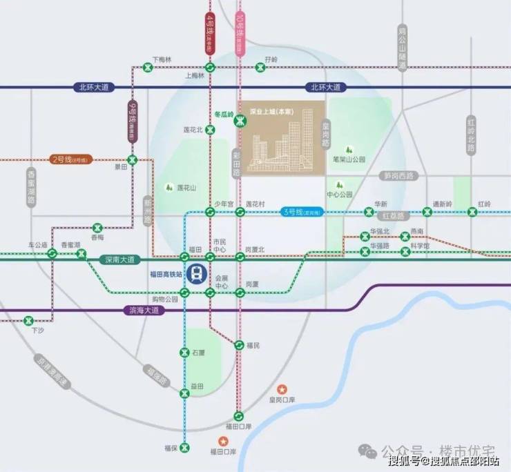 无缝接驳地铁10号线冬瓜岭站,纵享福田“一中枢、双口岸、四核心”枢纽体系,再造引桥匝道升级微循交通体系,高效互联湾区城市与全球资本。
