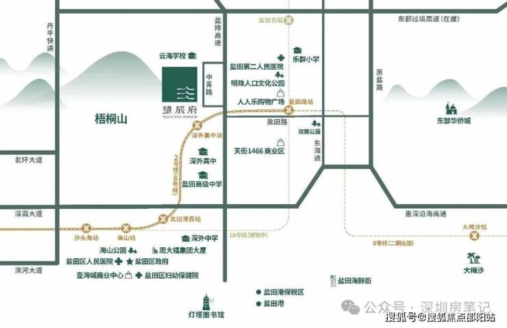 望辰府位于盐田港片区,中青路半山溪谷花园西侧,梧桐山半山腰上。这个位置,属于盐田港全新开发的区域,附近楼盘基本都是2015年后新建的,城市界面相当新。