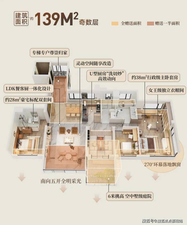 项目主力户型分别为119㎡四房两厅两卫、139㎡四房两厅三卫和172㎡四房两厅三卫。作为中山首批4.0住宅试点项目,户型实现户户带6米通高空中花园,带来约130%超高使用率和越级空间尺度,全系全南向四开间起步的极致面宽,所有户型配置阳光电梯厅独梯入户,LDK一体化设计带来更开阔的空间和更强的互动性。