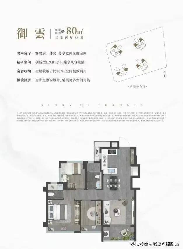 80㎡的3房2厅1.9卫,设计的是竖厅格局,客厅开间3.4米,LDKB一体化,S墙设计预留冰箱位,U型半开放式厨房,创新式1.9卫设计,得房率:78.99%(不含赠送),有西北、西南、东北、东南4个朝向。