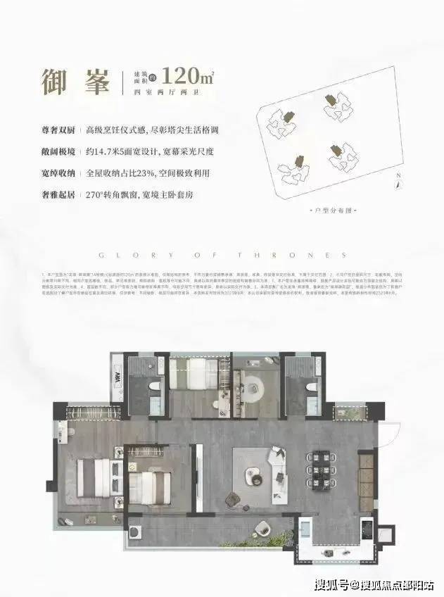 120㎡的4房2厅2卫,设计的是横厅南北通透格局,客餐厅开间8米,约14.7米超幕视野,超长阳台,主卧转角270°大飘窗,U型厨房,得房率:78.99%(不含赠送),阳台主朝西南或东南向。